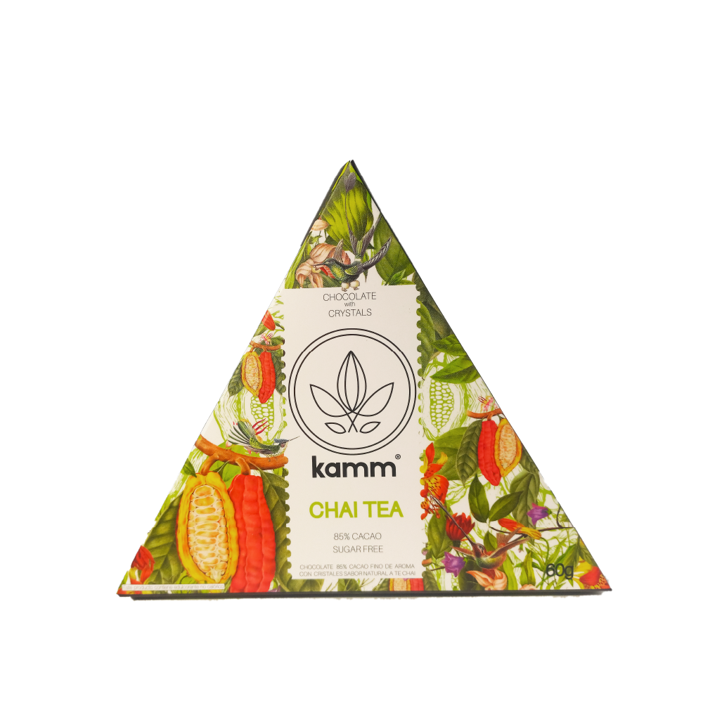 Kamm Chocolate Chai Tea es una tableta de chocolate artesanal que combina de manera sublime el rico sabor del cacao con las especias cálidas y aromáticas del chai, creando una experiencia envolvente y reconfortante. Este chocolate de autor lleva la experiencia del té chai a un nivel gourmet, fusionando la suavidad del cacao con una mezcla especiada de canela, cardamomo, jengibre, clavo y pimienta negra.